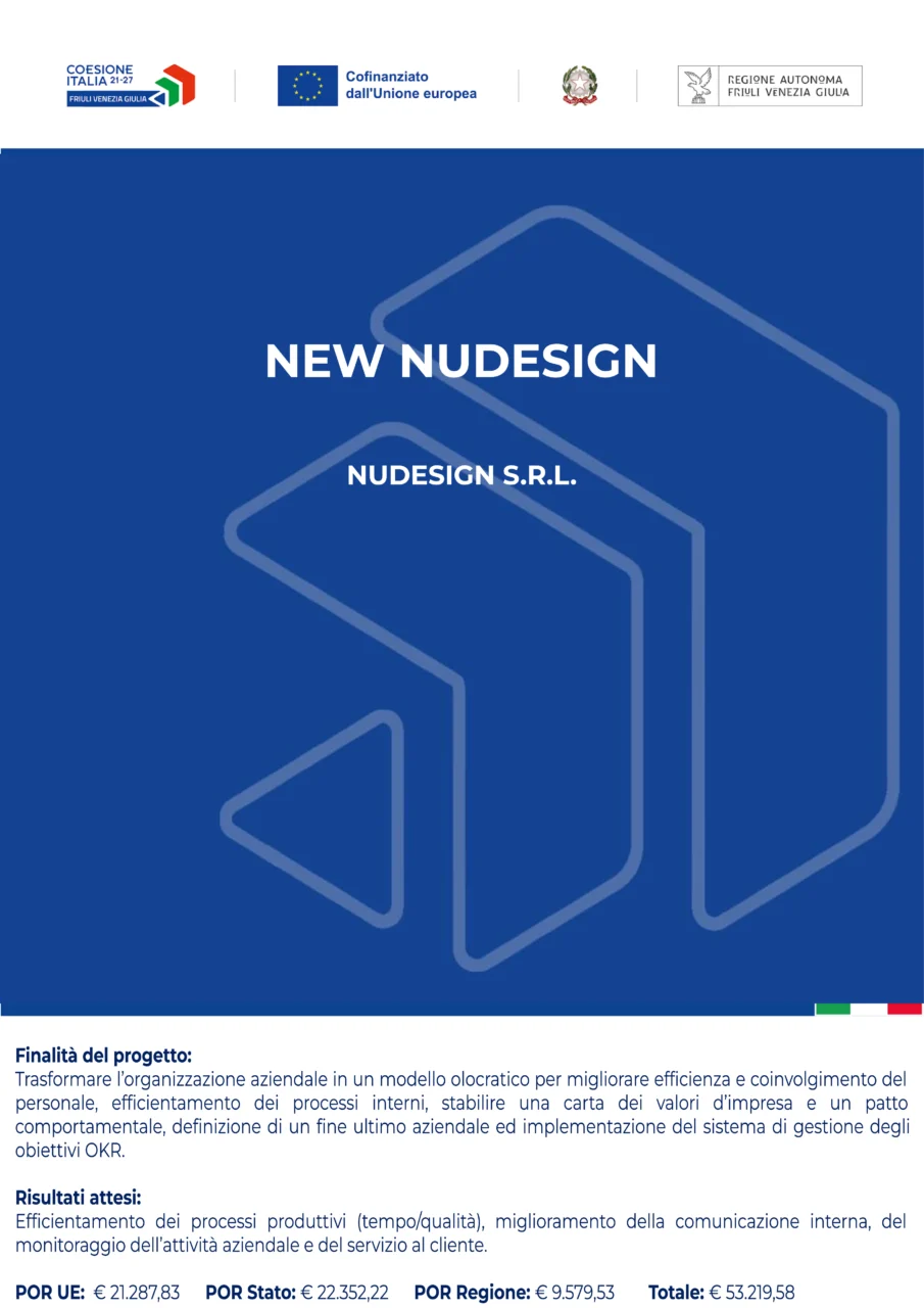 Nudesign S.r.l. ha beneficiato di contributi pubblici del PR FESR FVG nell’ambito di bandi per lo sviluppo e il rafforzamento dell’organizzazione aziendale.